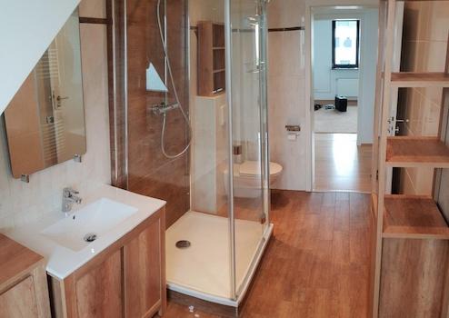 Das Badezimmer verfügt über neue Möbel, einen neuen Waschtisch, eine moderne, neue Dusche und eine Badewanne.