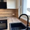 Küche (Neu): Eine moderne, Einbauküche ( Blanco geräte- Armaturen) ist bereits im Mietpreis enthalten. Sie überzeugt mit heller Optik, Arbeitsflächen in warmem Holz-Design und schicken schwarzen Akzenten (Spüle, Armatur).