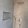 Badezimmer: Das Tageslichtbad ist ein Highlight. Große, moderne Fliesen in Betonoptik, eine bodengleiche Walk-In-Regendusche mit Glaswand und eine praktische Nische in der Dusche unterstreichen den Wellness-Charakter. Ein separates Gäste-WC im gleichen Design ist ebenfalls vorhanden.