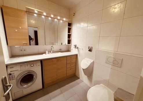Bad: Duschkabine, Spiegelschrank mit Stauraum; zusätzlich WC + Pissoir (bei Bedarf entfernbar)