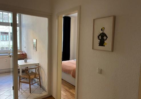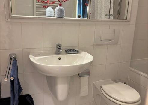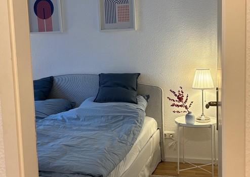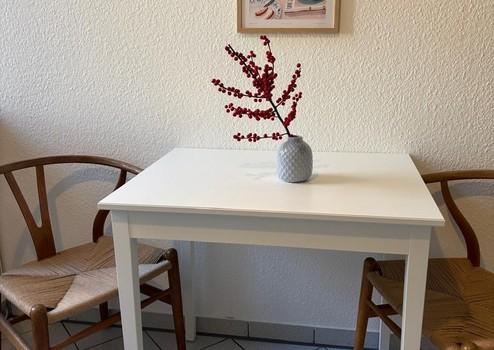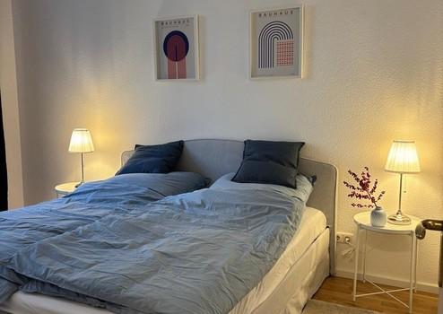 gemütlichen Essplatz. Ein 160 x 200 cm großes Bett und großer Kleiderschrank im Schlafzimmer. Sofa, Bücherregal, Kommode und Esstisch mit Stühlen im Wohnzimmer. Bad mit Badewanne und einer neuen Waschmaschine.