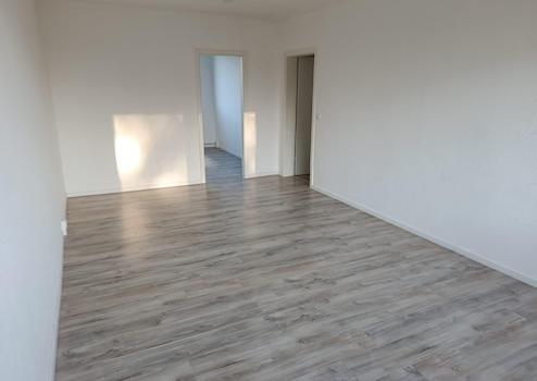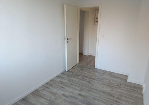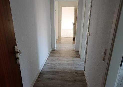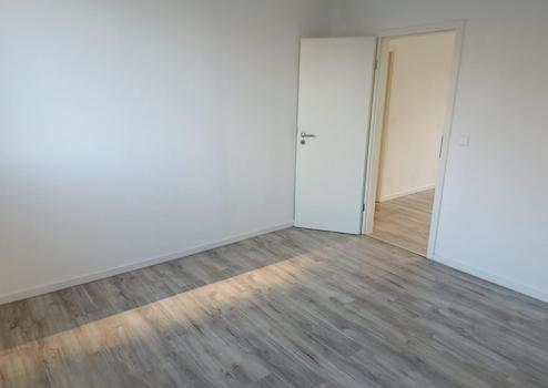 Helles Ambiente: In der gesamten Wohnung (auch in der Küche) wurde ein modernes, hellgraues Laminat verlegt. Das sieht freundlich aus und ist sehr pflegeleicht (keine hohen Türschwellen).