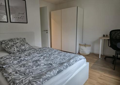 Helles Zimmer mit Blick ins Grüne. Voll ausgestattet: Bett (140 cm) inkl. Bettwäsche, Nachttischkommode, Nachttischlampe, Schreibtisch, Bürostuhl, Kleiderschrank, Fensterrollos.