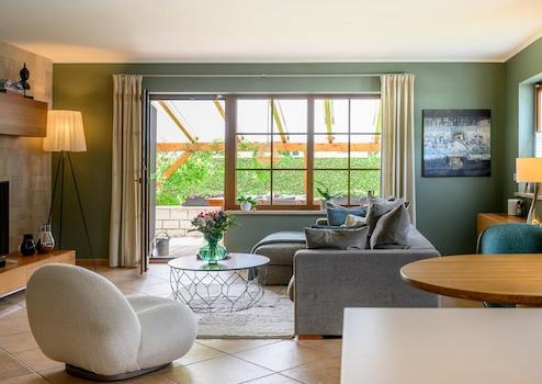 - Zugang vom Wohnbereich zur großen Holzterrasse und dem wunderschönen Garten