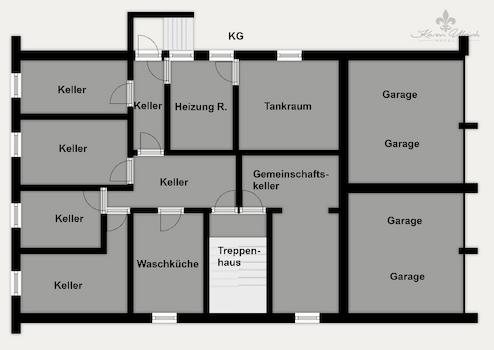 Das Haus ist vollständig unterkellert. Zu jeder Wohnung gehört ein eigenes Kellerabteil; ein gemeinschaftlicher Waschraum steht ebenfalls zur Verfügung.