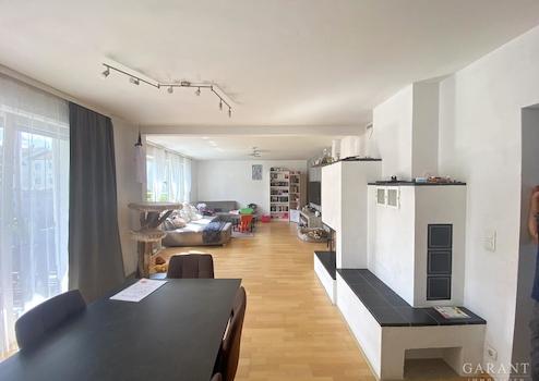 * großer Wohn-/Essbereich mit modernem Kaminofen