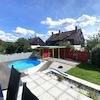Ein Kamin im Wohnbereich und ein Wärmeanschluss an den Kamin zu einem Zimmer im Obergeschoss lässt ein wohliges Behagen aufkommen. Ein Pool im großzügigen Gartenbereich mit Südterrasse lädt zu entspannten sonnigen Stunden ein.