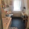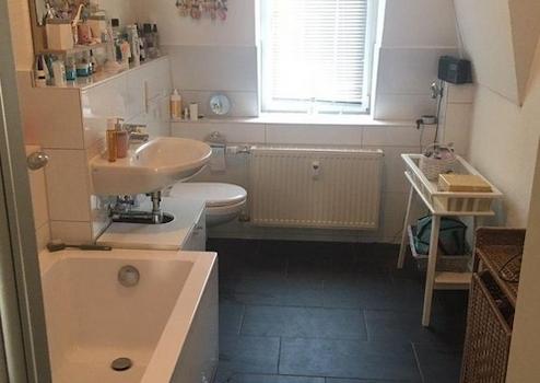 Bad gefliest, Laminat, Plattenheizkörper, Gaszentralheizung mit Warmwassererwärmung.