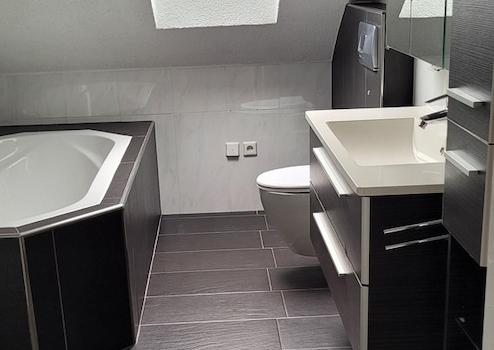 Modernes Tageslichtbad mit großer Glasdusche (1,4 m x 0,9 m) und großer 8-Eck-Acrylbadewanne