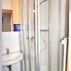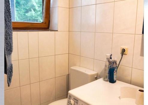 Das Badezimmer mit einer Dusche, Fenster und Waschmaschinenanschluss ausgestattet.