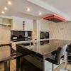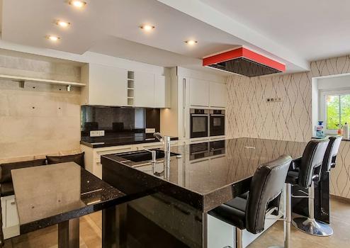 - Küche mit Einbauküche und Kochinsel mit leistungsstarker Deckendunstabzugshaube