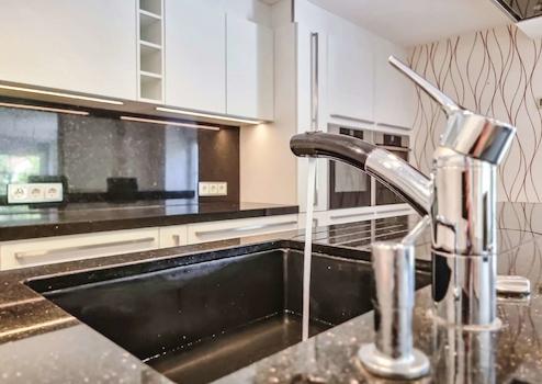 Die Küche ist mit einer modernen Einbauküche ausgestattet, die mit Einbaubackofen, Dampfgarer, Wärmeschublade und einer großen Kochinsel mit Deckendunstabzugshaube keine Wünsche offen lässt. In der Sitzecke mit einer polierten Granittischplatte lässt sich der Kochbereich gemütlich genießen.