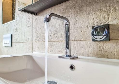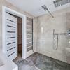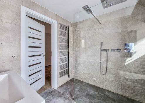 Ein modernes Tageslichtbad überzeugt mit einer ebenerdigen Regenfalldusche von GROHE Spa mit Licht- und Musikmodulen, einem Handtuchheizkörper, einem großen Wandspiegel sowie einem hochwertigen Waschbecken mit Unterschrank. Die exklusiven Wandfliesen und die Wohlfühlbeleuchtung schaffen eine angenehme Atmosphäre. Zudem sorgen Downlights und die Fußbodenheizung für zusätzlichen Komfort.