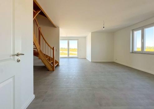 Bereits beim Betreten des Hauses über den Eingangsbereich spürt man die durchdachte Raumaufteilung und den hochwertigen Charakter des Hauses. Der Flur bietet ausreichend Platz für eine Garderobe und führt zum Gäste-WC sowie zum praktischen Hauswirtschaftsraum, in dem Technik und Waschmaschine bequem untergebracht werden können. Von hier aus gelangt man in den lichtdurchfluteten, offenen Wohn- und Essbereich, der mit seinen großen Fensterfronten und dem direkten Zugang zur Terrasse den Mittelpunkt des Hauses bildet. Das gesamte Erdgeschoss ist mit hochwertigen Fliesen gefliest.