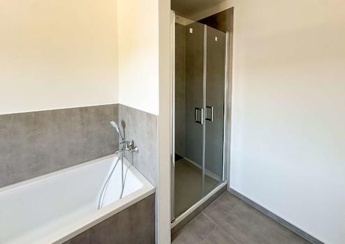 Im gesamten Haus sorgt eine angenehme Fußbodenheizung für wohlige Wärme, während elektrische Jalousien zusätzlichen Komfort und Schutz vor Sonne bieten. Über die Treppe erreichen Sie das Obergeschoss, das mit einem zentralen Flur beginnt, von dem alle Räume abgehen. Das großzügige Schlafzimmer mit angrenzender Ankleide bildet hier eine komfortable Rückzugsoase. Ein weiterer Raum eignet sich ideal als Kinder- oder Arbeitszimmer. Das Tageslicht-Badezimmer ist modern ausgestattet und bietet sowohl eine Dusche als auch eine Badewanne. Ein zusätzlicher Abstellraum schafft praktischen Stauraum auf dieser Ebene.