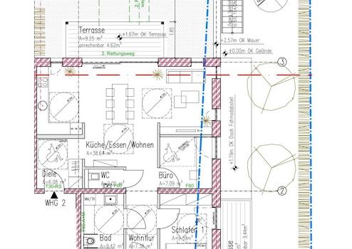 Das Angebot bezieht sich auf die Wohnung 1 im Erdgeschoß. Sie gelangen über eine geräumige Diele mit Garderobe in die Wohnung. Von der Diele gelangen Sie in das Gäste-WC sowie in den das Büro von ca. 8 m². Ebenso gelangen Sie in hellen geräumigen Wohn/Eßbereich mit offener Küche von ca. 30 m² sowie auf die sonnige Terrasse von 11 m² sowie in den eigenen Garten Über den Wohnbereich gelangen Sie in den separaten Schlaftrakt. Dieser besteht aus dem geräumigen Bad mit Fenster von ca. 9 m² ausgestattet mit Dusche und Wanne, dem gut aufgeteilten Elternschlafzimmer von ca. 13 m², dem funktionellen Hauswirtschaftsraum von . 6 m² sowie dem hellen Kinderzimmer/Büro von ca. 10 m² mit Zugang auf die zweite Terrasse sowie in den Garten. Die Wohnung hat eine Wohnfläche von ca. 110 m². Der Wohnung ist ein Kellerraum zugeordnet.