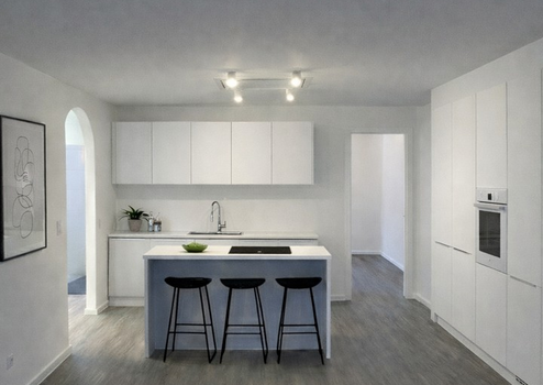 Der Küchenbereich ist gut durchdacht und bietet eine einmalige Möglichkeit eine eigene Küche nach Ihrem Geschmack anzubringen. Durch einen Bodenanschluss ist sogar eine Kücheninsel als Koch- oder Essplatz möglich.