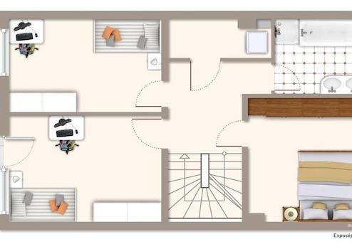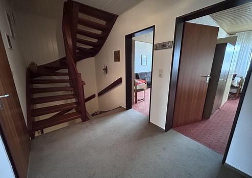 •Obergeschoss: Über eine massive Betontreppe erreicht man das Obergeschoss, aufgeteilt in einen geräumigen Flur, drei Zimmer – die wahlweise als Schlafzimmer, Kinderzimmer und/oder Büro/Gästezimmer genutzt werden können -, einem Vollbad sowie einem Abstellraum mit Waschmaschinenanschluss