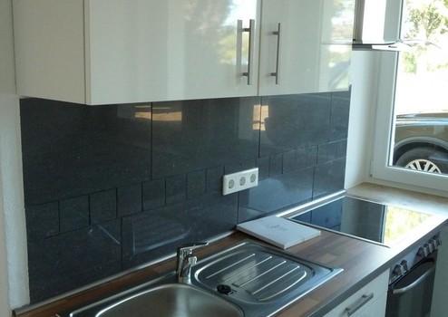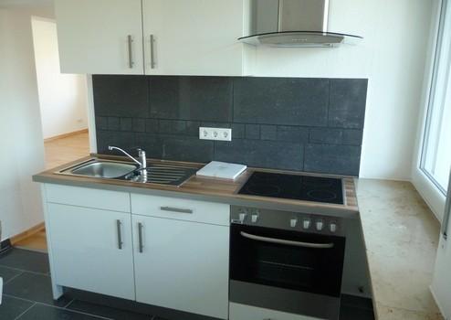 Stauraum für Küchenutensilien bietet die vorhandene weiße Einbauküche ( Lackfront ) mit Kühl/Gefrierschrank, Ceranfeld, Backofen, Dunstabzugshaube.