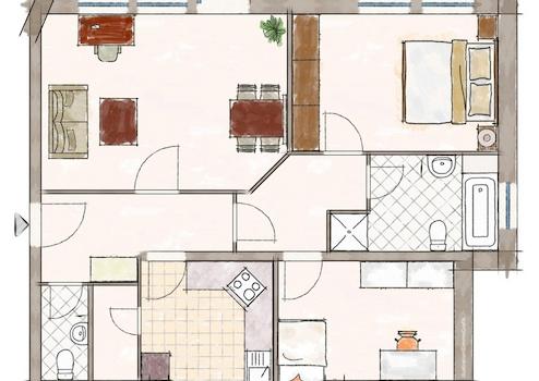 Großzügiger Wohn-/Essbereich, zwei Zimmer, Küche,