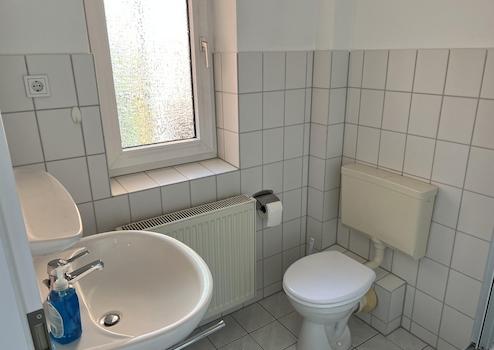 Die Wohnung verfügt über eine Einbauküche mit Cerankochfeld sowie einen separaten Abstellraum mit Waschmaschinenanschluss; Waschmaschine und Trockner sind bereits vorhanden. Ein Balkon mit ruhigem, grünem Ausblick, ein eigener Kfz-Stellplatz hinter dem Haus, Aufzug und Gegensprechanlage runden die Ausstattung ab. Zur gemeinschaftlichen Nutzung stehen ein Münztrockenautomat und ein abschließbarer Fahrradraum zur Verfügung.