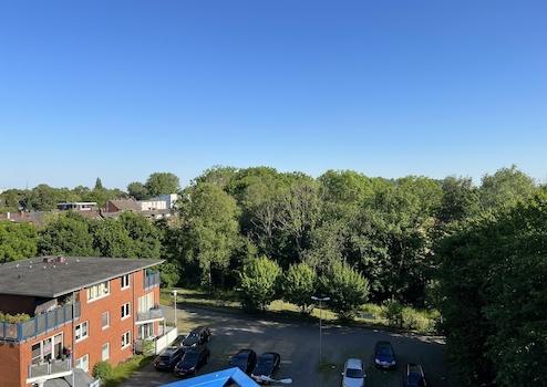 Das kombinierte Wohn- und Schlafzimmer sowie der gemütliche Balkon liegen zur ruhigen Rückseite des Hauses und bieten einen weiten, grünen Ausblick über Bäume und die umliegende Nachbarschaft – ideal zum Entspannen nach Feierabend.