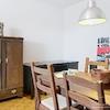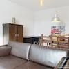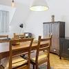 Das helle Wohnzimmer ist mit einem komfortablen Sofa ausgestattet und verfügt über einen integrierten Essbereich mit Platz für bis zu vier Personen.