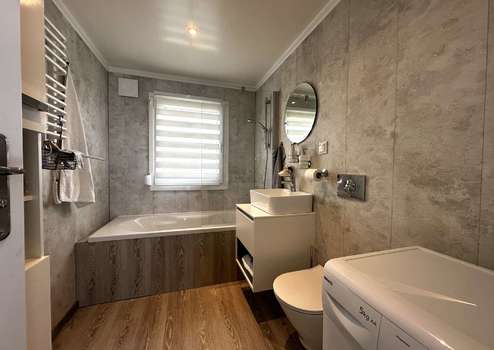 Badezimmer: Ausgestattet mit hochwertigen Armaturen, Badewanne, Waschmaschinenanschluss, Fenster und stilvollen Feuchtraumpaneelen.