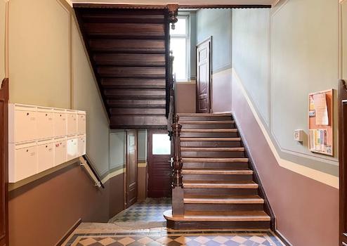 Schon im Eingangsbereich begrüßt Sie eine prachtvolle originale Stuckdecke. Das Treppenhaus wurde liebevoll saniert, der dekorative historische Wandanstrich wiederhergestellt und die alten Türen fachgerecht aufgearbeitet. Die aktuell leerstehende Wohnung wird derzeit umfassend modernisiert.