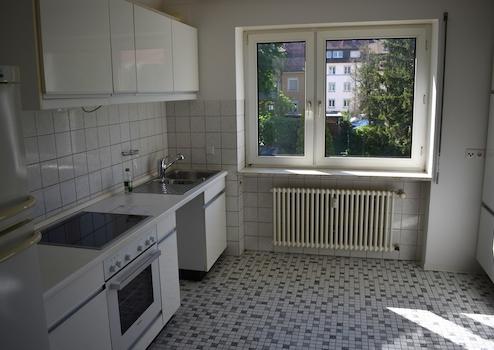 Küche mit Kühlschrank und Gefrierschrank, Umluftherd.