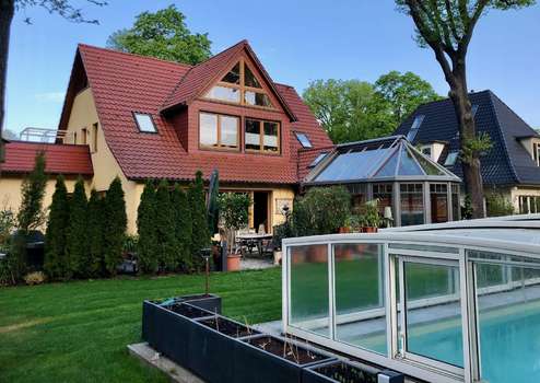 Die geräumige, modernisierte Villa, mit großzügiger Ausstattung, liegt in einer Seitenstraße in zweiter Reihe an der Dahme von Wendenschloss. Die Fähre nach Grünau oder die Straßen-bahn in die Altstadt oder zum S-Bahnhof von Köpenick sind fußläufig zu erreichen, genau-so wie Kitas und Schulen Alle Einrichtungen des täglichen Bedarfs wie etwa drei Supermärkte, Apotheke, Reisebüro, Friseur, asiatischer Lebensmittelhändler, Ärztehaus, Blumen-laden, Poliklinik, Tankstelle etc. sind vom Objekt bis zwei zu Kilometer entfernt. Das Krankenhaus Köpenick und die Altstadt sind 5 km entfernt. Wendenschloß ist ei-ne Ortslage des wasser- und waldreichen Berliner Ortsteils Köpenick im Bezirk Treptow-Köpenick und grenzt an den Langen See bzw. an die „Dahme“ im Westen und Süden, den Müggelbergen im Osten und der Altstadt Köpenick und Kietzer Feld im Norden. Köpenick ist der waldreichste Bezirk Berlins. In Wendenschloß befinden sich das Strandbad Wendenschloß sowie zahlreiche Badestellen am Langen See, die im Sommer als Ausflugs-ziele dienen. Waldgaststätten wie der Schmetterlingshorst bilden weitere Anlaufpunkte für Ausflügler.