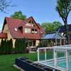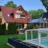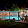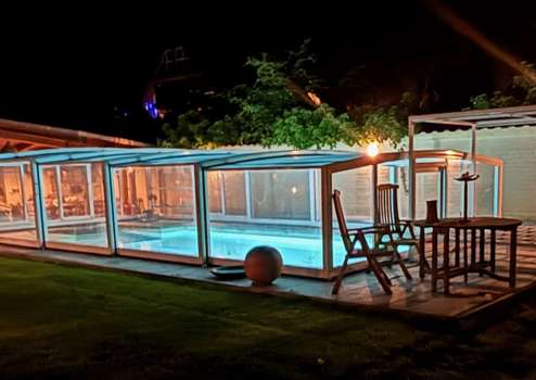Die Schwimmhalle besteht aus einem 8x4m großem beleuchteten Pool und einer 2x2m großen, Granit belegten Treppe und ist mit schweren Granitplatten umrandet. Die hoch-wertige Schwimmhallenüberdachung steht auf Rollen und hat eine Abmessung von ca. 10x6m; die seitlichen Sichtfelder bestehen aus Echtglas. Poolfilter, Poolpumpe, und Ventile sind frostsicher im Keller der Villa verbaut.