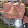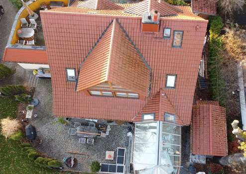 Das Dach des Gebäudes ist mit engobierten Tonziegeln eingedeckt; Regenrinnen und Fallrohre bestehen aus Kupfer.