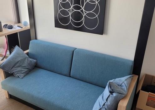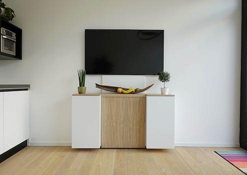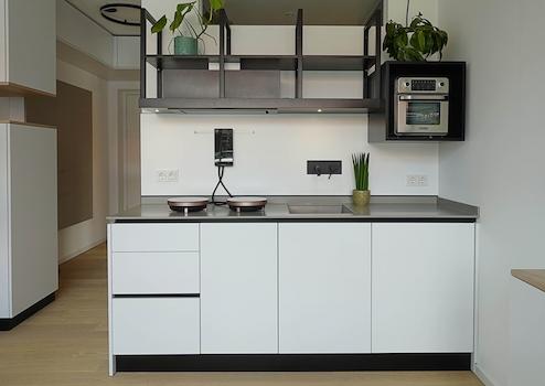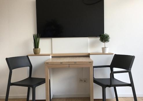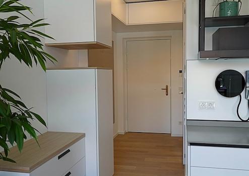 Es ist hochwertig und vollständig möbliert incl. Küchenzeile. Ausreichend Stauraum bietet der 2,80 m hohe Flur mit seinen Hochschränken. Hier müssen Sie auf nichts verzichten. Ein Klappbett sorgt für großzügigen Schlafkomfort und ist im Handumdrehen in einen Wohnraum oder in Ihr Homeoffice verwandelt, ganz nach Ihren Bedürfnissen. Sollten Sie mal Platz brauchen, z.B. für Joga oder Workouts, klappen Sie auch den Esstisch einfach herunter und wandeln Sie Ihr Apartment in einen Fitnessraum. Selbst wenn mal Gäste kommen, könne Sie den faltbaren Esstisch für bis zu 4 Personen ausklappen.