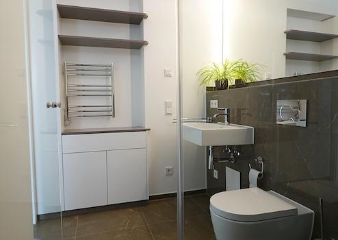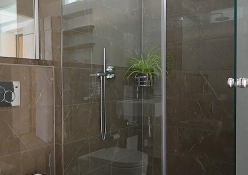 * Großzügiges Badezimmer mit Rainshower-Dusche und Handtuchwärmer