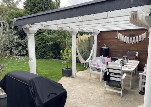 Besonderes Highlight ist der Garten mit Terrasse auf der Rückseite des Hauses mit zusätzlicher praktischer Außendusche. Die Terrasse ist mit einem überdachten Glasdach ausgestattet, das einen optimalen Schutz vor Regen bietet und gleichzeitig für ausreichend Helligkeit sorgt. Der Vorgarten verfügt zusätzlich über eine Sitzgelegenheit mit Gartenlaube, die zum Verweilen einlädt.