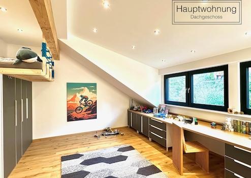 Der Grundriss wurde verändert, um eine offene, helle und gleichzeitig gemütliche Wohnatmosphäre zu schaffen. So entstand ein neues Bad in der Hauptwohnung, ein Schlafzimmer mit Ankleide und vorgelagertem Flur für zusätzlichen Stauraum sowie ein großes Homeoffice für die ganze Familie. Die Küche wurde vom Schreiner gefertigt und ist mit hochwertigen Komponenten ausgestattet.