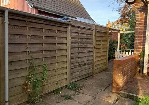 Erneuerung der straßenseitigen Stellplatzbefestigung vor dem Anbau (2017) (Pflasterarbeiten in Klinker) Die Terrasse zum Garten würden wir empfehlen aufzunehmen und neu zu legen, ebenso ist dort ein Holzbalken des Überstand/Regenschutz beim Ausgang der Küche in den Garten zu erneuern.