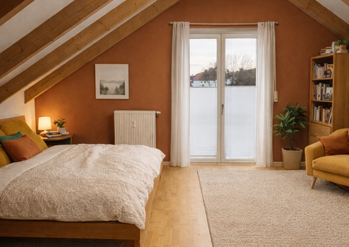 Das wunderschön ausgebaute Dachgeschoss mit offenen Dachbalken bietet zwei große, helle Schlafzimmer sowie ein modernes Badezimmer mit Dusche und schafft eine besonders wohnliche Atmosphäre.