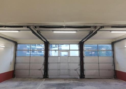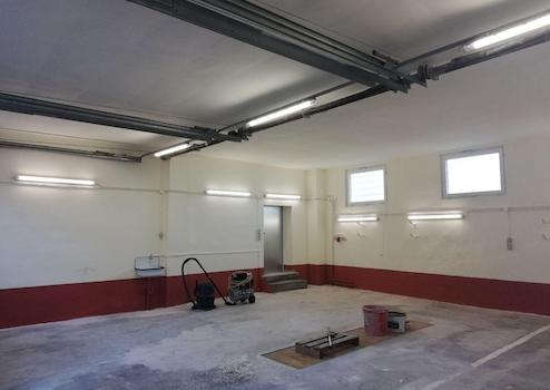 Die Halle verfügt über Strom, Wasser und Heizung. Die großen Tore lassen sich vollständig öffnen.