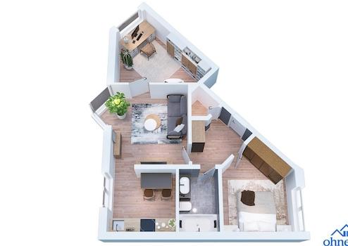 Aufgrund des Schnitts ist sie ideal geeignet für Seniorenpaare oder ledige Arbeitnehmer mit Home Office.