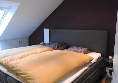 Hier erwartet Sie ein außergewöhnliches Dachstudio mit großen Dachflächenfenstern im Schlafzimmer mit 32 qm und Einbaukleiderschrank und Klimaanlage für sehr heiße Tage. Weiter gehören zum Dachgeschoss ein Wirtschaftraum für Waschmaschine und Wäschetrockner. Die Dachschrägen sind alle durch Einbauschränke ausgestattet und bieten extra viel Stauraum.