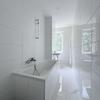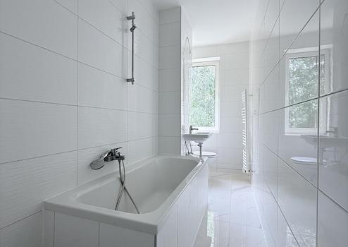 Bad deckenhoch gefliest mit hochwertigen weißen Fliesen, teilweise mit 3D Optik für ein größeres Raumgefühl.