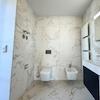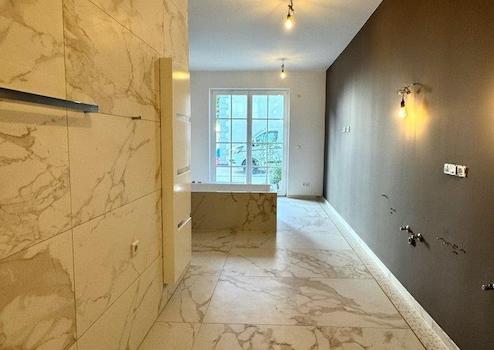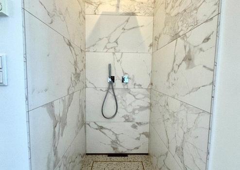 Das luxuriöse Bad mit Badewanne, bodengleicher Dusche und hochwertigen Fliesen sorgt für ein besonders elegantes Wohngefühl. Zusätzlich steht ein separates Gäste-WC zur Verfügung.