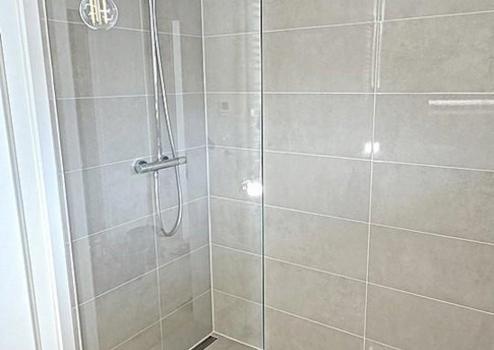 * großflächige hochwertige Bodenfliesen im Bad und in den