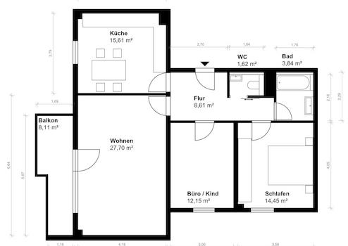 Man betritt die Wohnung über eine Diele, von der man in alle Räume gelangt. Das sehr großzügige Wohnzimmer bietet viele Gestaltungsmöglichkeiten. Vom Wohnzimmer gelangt man auf den überdachten Balkon in süd-östlicher Ausrichtung.