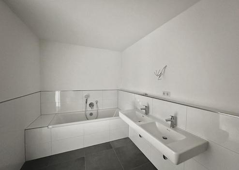 Das Badezimmer ist ein echtes Highlight: Es erwartet Sie eine Badewanne, zwei Waschbecken und eine begehbare Dusche. Die Wandfliesen in edlem Weiß und die Bodenfliesen in zeitlosem Grau verleihen dem Raum eine hochwertige und stilvolle Note. Der gesamte Bereich schafft eine luxuriöse und gleichzeitig entspannte Atmosphäre – ein Ort, an dem Sie gerne Zeit verbringen.
