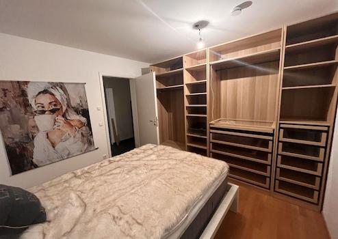 Das gemütliche Schlafzimmer ist ausgestattet mit einem 180x200cm Bett mit Taschenfederkernmatratze, Topper, kl. Nachttische, ein gepoltsterter moderner Schaukelsessel und einem hochwertig eingerichteten grossen Kleiderschrank.