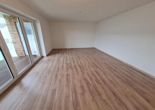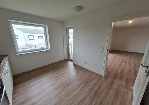 Die Wohnung verfügt über zwei Schlafzimmer, Wohnzimmer mit offener Küche inkl. moderner, heller Einbauküche, Duschbad, Gäste-WC, HWR (m. Waschmaschinen-Anschluss) und einen großzügigen und teilüberdachten Balkon mit Süd-Ost-Ausrichtung sowie einem Abstellraum direkt auf dem Balkon (z.B. für Stuhlauflagen oder kühle Getränke). Das Wohnzimmer ist hell und hat große, bodentiefe Fenster.