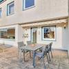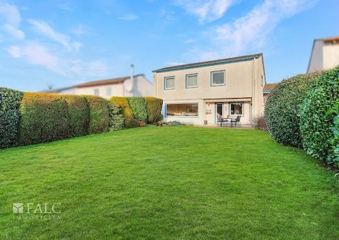 Über wenige Stufen gelangt man auf die nächste Wohnebene mit dem offen geschnittenen Wohn- und Essbereich. Große Fensterfronten sorgen für viel Tageslicht und schaffen einen fließenden Übergang zwischen Innenraum und Garten. Der Blick nach draußen wirkt wie ein lebendiges Gemälde, das sich mit den Jahreszeiten verändert. Dank der südlichen Ausrichtung ist dieser Bereich besonders lichtverwöhnt. Der direkte Zugang zur großen Terrasse und zum weitläufigen Gartengrundstück eröffnet vielfältige Nutzungsmöglichkeiten, von Spielbereichen für Kinder über gemütliche Grillabende bis hin zum eigenen Gemüsegarten. Eine zweite Terrasse im Garten ergänzt das Angebot und schafft zusätzliche Aufenthaltsqualität.